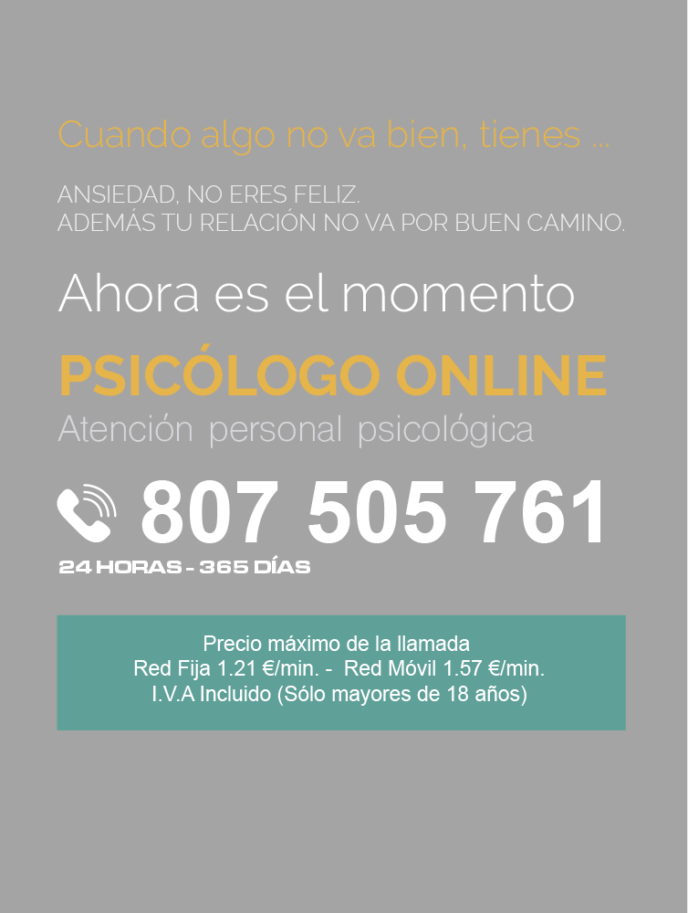 Con solo descolgar el teléfono y marcar el 807 505 761 un licenciado en psicología con amplia experiencia, te ofrece la ayuda psicológica online que necesitas en momentos de crisis o urgencia o simplemente te puede asesorar en lo que precises, hablando únicamente los minutos necesarios para dar respuesta a lo que te preocupa.